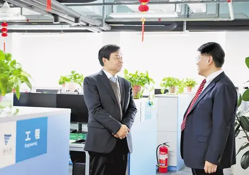 2月12日,在位于石家庄市的新众业建设集团,全国政协委员、北京德恒(石家庄)律师事务所负责人齐明亮(左)与企业负责人交流。河北日报记者 张晶 摄