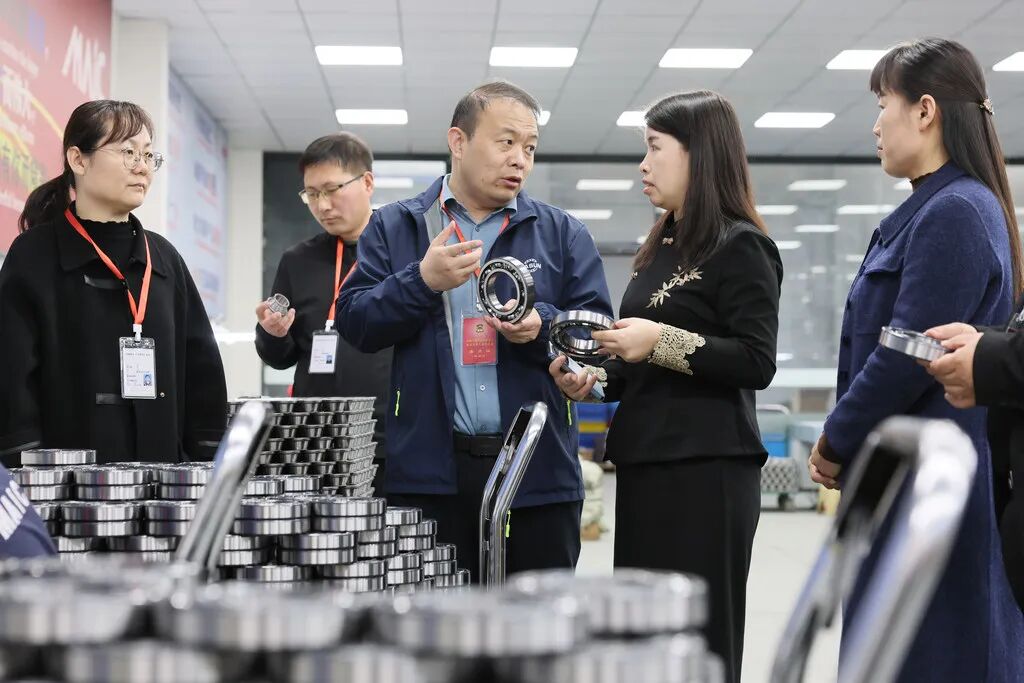 3月30日,在邢台迈驰轴承制造有限公司生产车间,张厚发委员(中)和企业负责人毕尚芝(右二)交流产品检测流程和质量管控情况。河北日报记者 霍艳恩摄